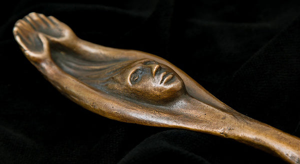Unique cast bronze, .75 x 7.5 x 1.5 inches. Balanced for steadiness on a flat surface.